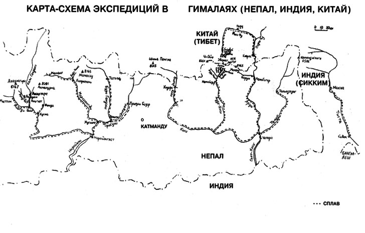 Карта-схема экспедиций в Гималаях (Непал, Индия, Китай)
