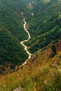 В первый раз в июле 1999 г. на двух катамаранах (четверка и двойка) мы прошли самое начало (4 км) до пор. No 3 "Грозный" (Селевой No 2). Просмотрели пор. No 3, No 4 и частично Шаукольский каньон. С учетом увиденного стало ясно, что всю Малку мы по времени пройти не успеваем. Разобрав каты, вернулись на курорт Джили-Су, еще раз искупались в ваннах и на двух местных УАЗиках обвезли верхний участок. Разбитая грунтовка идет по левому берегу Малки от Джили-Су до устья р. Харбас высоко над водой и в стороне от реки. Мы высадились примерно в 3 км выше устья р. Харбас. Спуск к Малке по крутому склону ущелья занял полдня. От этого места мы сплавились до пос. Хабаз. Летняя Малка произвела на всех очень сильное впечатление, и захотелось сюда вернуться, чтобы пройти верхний участок.