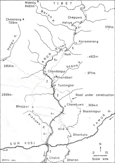 На 60-километровом участке от р. Барун до пос. Тумлингтар совершено наиболее полное прохождение реки Арун, в том числе: