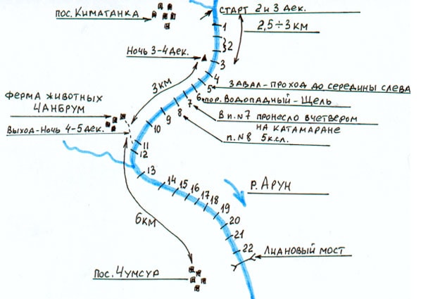 Мы выбрали поздний послемуссонный период, рассчитывая на средний и ниже среднего уровень воды для нашего сплава, надеясь на то, что в верхних, труднопроходимых по берегу каньонах реки, появятся участки спокойной воды, более выраженные улова, необходимые для чалки наших судов. Таким образом, использовав общее падение уровня воды в реке, дойти до участка уже известного нам Аруна.