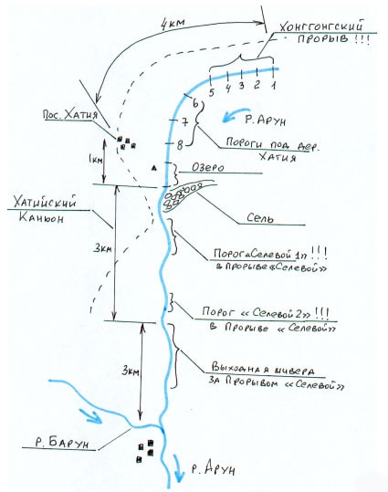 | 6 | Секция «Деревня Хатия - Прорыв Селевой – река Барун». L~ 7 км | Порог Селевой 1 = «Прорыв Селевой» 6+++!!! к.с. Длина 600 - 800 метров. Порог начинается от селя, сошедшего с левого берега, и образовавшего порог. В пороге хаос больших и небольших камней, глыб и скал. Мощные жесткие сливы с могучими бочками. Сложная линия движения. Человек, выпавший на заходе, в середине или метров за 200 до выхода из порога живым не дойдет. Риск на всех сплавсредствах, кроме бублика, выше допустимого. Да и на «бублике», впрочем, риск выше допустимого, так как в случае прокола на заходе или выпадении за борт гибель гребцов неминуема. Мы прошли порог на «бублике». Порог Селевой 2 «Прорыв Селевой» 6+++!!! к.с. Длина 400 м. Разведка порога Селевой 2 с тропы невозможна. Порог не просматривается. Порог образован скалами, свалившимися с правого берега при недавнем обвале. Сильнейший водосброс с узкими змеевидными проходами между скал, водопадами до 4 м, наимощнейшими бочками. Управлять в пороге практически невозможно. Риск выше допустимого. Мы прошли порог на «бублике». |