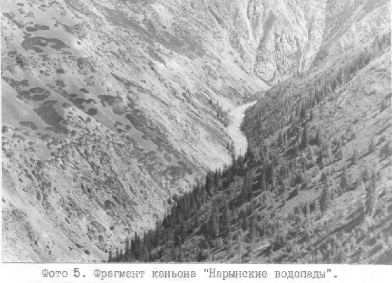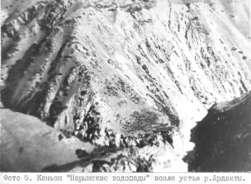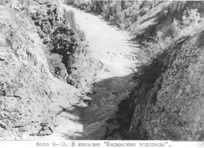 2. Таким образом, на р.р.Большой Нарын и Нарын остался непройденным лишь 3хкаскадный водопад в самом начале каньона “Нарынские водопады”. Как утверждали наши предшественники (в частности, Г.В.Кузнецов), “водопад абсолютно непроходим в любую воду для любых судов”. Мы с самого начала приняли за аксиому эту оценку Кузнецова, поэтому о возможности прохождения водопада у нас даже мысли не возникало. Мы рассматривали водопад с большой высоты (около 300м), откуда в принципе нельзя было судить о его проходимости или непроходимости. Однако возможно, что на очень хорошем судне и при очень большом желании пройти водопад удастся.