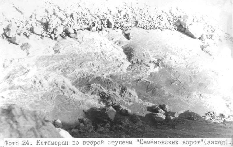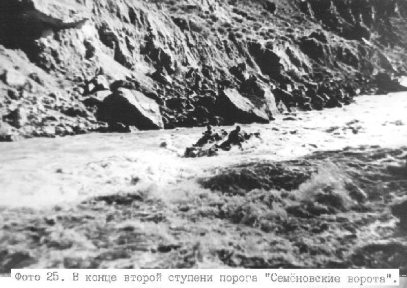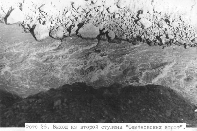 образовавшихся при попытке строительства дороги в Казарман по левому берегу Нарына (убедившись в осыпном характере пород, эту попытку прекратили). Правый берег – скальный, обрывист; левый – крутые осыпи. Разведка по левому берегу как с верхней террасы (на высоте 60-70м), так и вблизи воды. Страховку устанавливали на левом берегу в трёх местах – после первой ступени (при ёё прохождении нужно подстраховаться, чтобы не “влететь” во вторую ступень неготовыми), а также после второй ступени и в конце каньона (после острова) (при дальнейшем прохождении каньона). После первой ступени приставали к отмели правого берега. Первая ступень, пр.37 (схема 3, фото 19-23), сильно подпружена, у левого берега – противоток. В левой части слив 2-2,5м. Заходили в левой половине русла (но правее слива) и за сливом резко смещались влево, уходя от вала. Через 100м быстротока расположена вторая ступень порога.