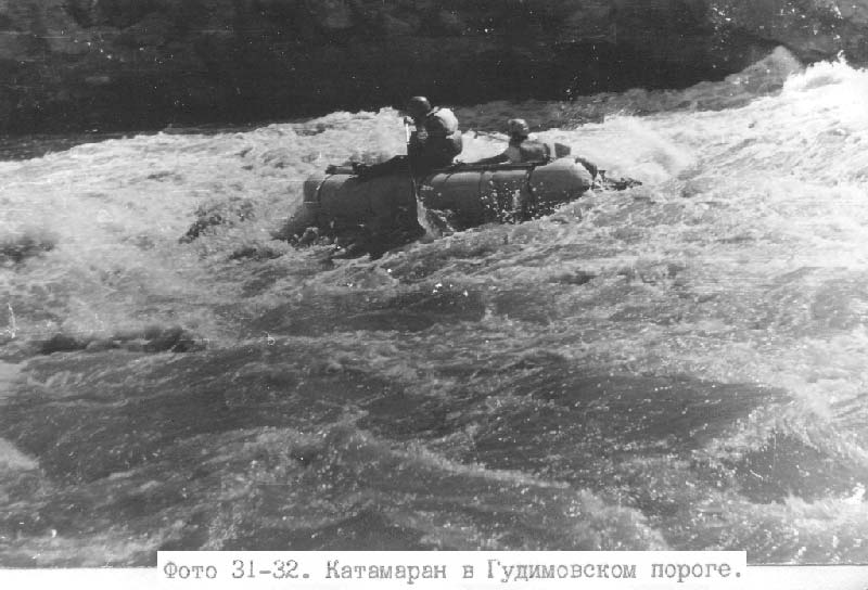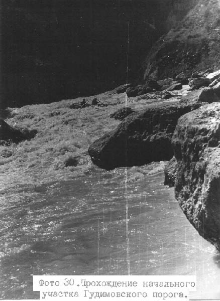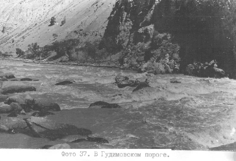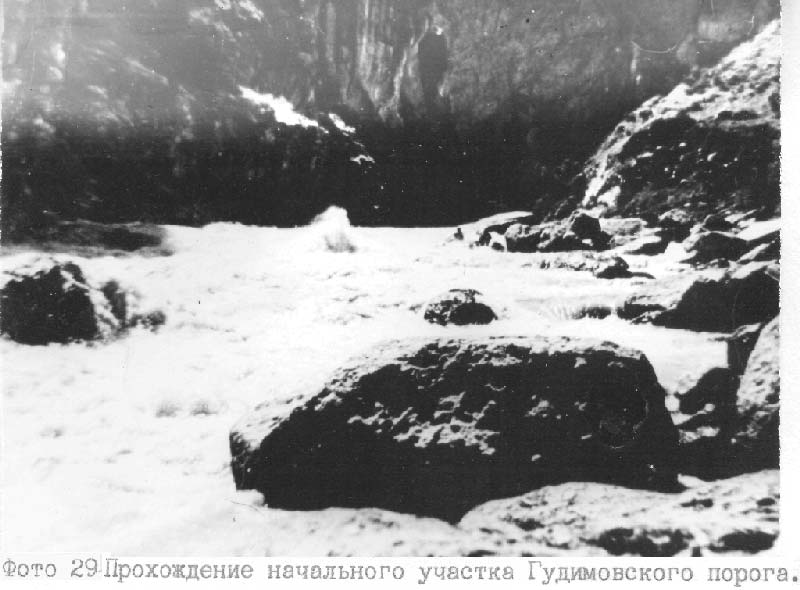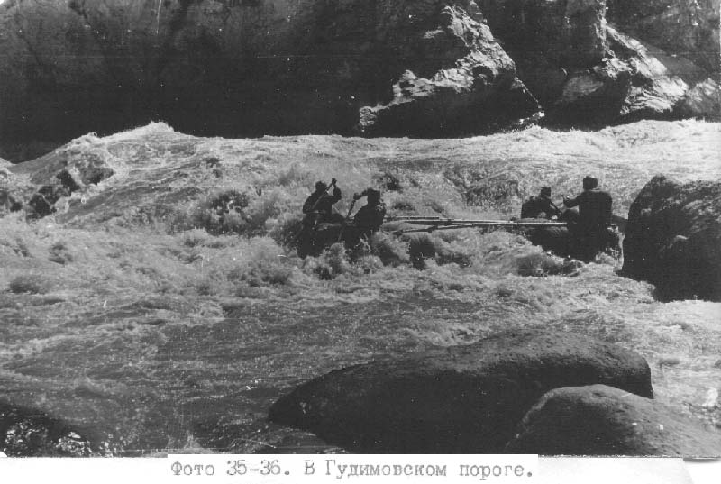313-314 км – пр.40 – пор.“Гудимовский” (схема 5, фото 28-37). Длина сложного участка 0,5 км. Расположен после крутого правого поворота. Течение перед ним замедляется. Разведка – левым берегом. Страховка – с левого берега. На входе слева – ручей. Большие валуны. Левый берег – невысокая терраса. На начальном участке основной слив – у правого берега. В сливе – крупный камень с пульсирующим валом. Очень опасное место. Однако у самого левого берега есть значительно менее опасный проход, которым мы и воспользовались. Если идти этим путем, то на первых 50м порога (которые группа Кузнецова обносила) вам встретятся сливы и валы максимум 1,5м. Тем не мене, линию движения нужно соблюдать строго. Порог серьёзный, VI категории сложности.