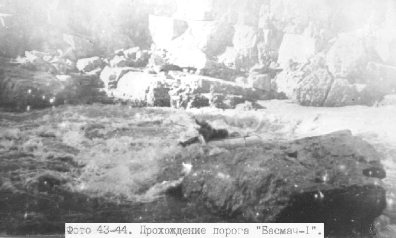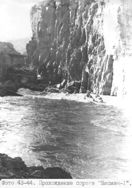 Порог “Басмач-2”, пр.43, расположен под мостом. Осмотр по левому берегу. Узкий крутой слив. Высота стен 50-60м. После порога “Басмач-2” каньон тянется ещё примерно на 1,5 км. И если препятствия 42 и 43 (собственно слив) не очень сложны для прохождения (хотя это хорошие пороги V к.с.), то затем в каньоне (после моста) стоит хаотичный вал (причем, косой) высотой 2м, что очень усложняет сплав. Оценили весь каньон VI категорией сложности. На выходе из каньона улов и песчаный пляж на левом берегу.