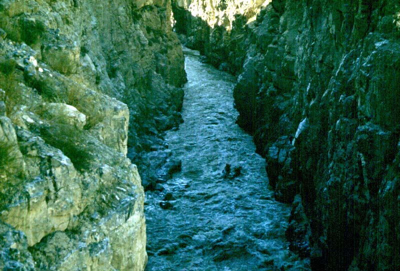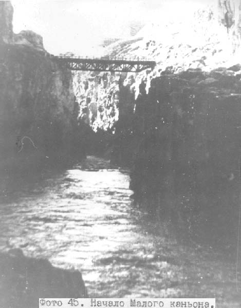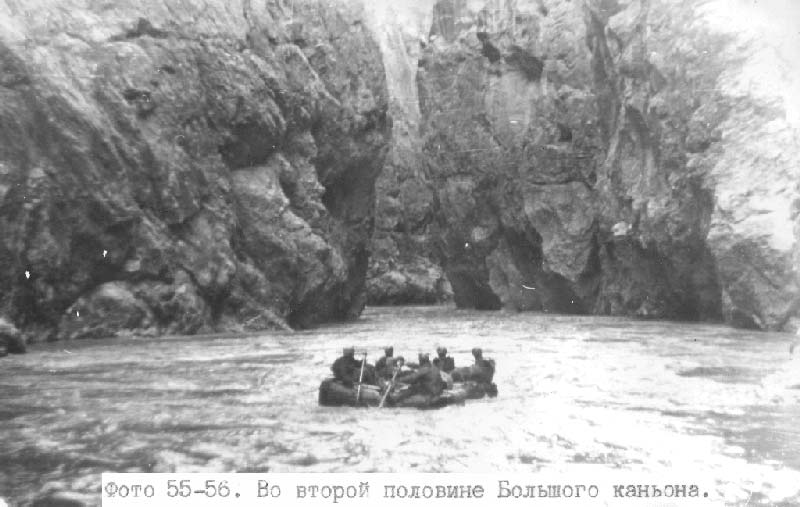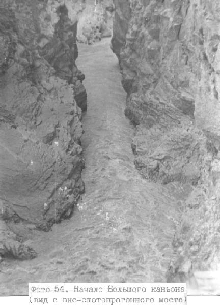 326-333 км – пр.44, 45, 46 – “Большой каньон” (фото 52-56). Его длина около 7 км. Большой уклон. Труднодоступен. Представляет собой скальный коридор шириной 5-15м и высотой 300-400м. Состоит из двух участков: первый заканчивается через 3 км, когда стены немного расступаются, а ещё через 300-400м река опять втискивается в узкую щель. Мощные сливы, высокий вал, водовороты. “Большой каньон” - очень серьёзное препятствие, особенно первая его половина. Без сомнения, VI к.с. И, пожалуй, первая половина каньона – самое опасное препятствие на всём маршруте. На протяжении всей первой половины каньона хаотичный вал 2-2,5м (а иногда и 3м). Очень тяжело идти. Вторая половина каньона проще. Начальный участок 200м хорошо просматривается с бывшего (он уже сломан) скотопрогонного мостика на входе в каньон. До порога “Киргизия” осмотр нужно провести по высокому правому берегу. Проходить каньон нужно с обязательной взаимоподстраховкой при движении в кильватерной колонне (с отдельными остановками в тени камней).