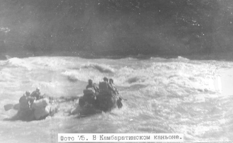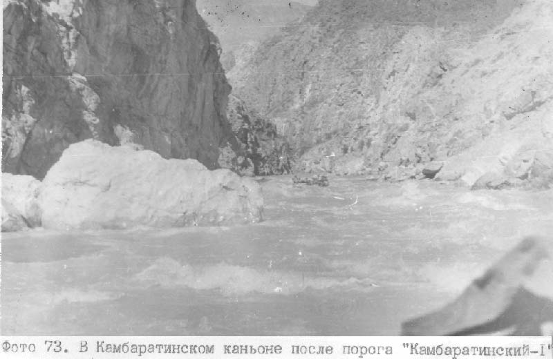Порог “Камбаратинский-1” – пр.64 (схема 10). Расположен в 600м от начала каньона. Длина порога 100м. Очень серьёзное место. Перед порогом вода успокаивается. В пороге – крутой слив 2,5м. За сливом через всё русло огромный вал 3,5м, но без пенного гребня. Далее идут также высокие валы. Затем на протяжении 150-200м вода мечется между стенками. Воронки. Страховка – с правого берега ниже порога, а также с воды. Проходили по центру.