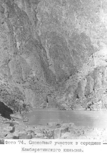 469-473 км – пр.64, 65 – каньон “Камбаратинский” (фото 73-75). Очень мощные препятствия. Вал до 3-3,5м, есть сливы до 1,5-2м (правда, пологие). Особенно сложны пороги 64, 65 и 65а. Каньон VI к.с. Начинается резким сужением после островков ниже устья р.Толук на левом повороте. Ориентир – сужение долины, резкий уклон русла. На высокой террасе правого берега небольшое деревянное строение. Вокруг него остатки активной в прошлом деятельности человека – трубы, проволока и пр. Как мы поняли, это следствие неудачной попытки строительства в этом месте Камбаратинской ГЭС (несмотря на всевозможные сообщения, что она строится). Сложность препятствий в каньоне нарастает постепенно. На входе валы до 1,5м, водовороты. Затем уклон возрастает, растёт скорость течения. Обилие воронок, прижимов. Вода внезапно вскипает буграми до 1,5м и более. Много уловов, где можно легко причалить к берегу и надёжно подстраховать с воды. Нижний участок каньона несколько проще. Длина каньона 4 км, ширина часто 7-10м, высота стен 10-15м. Осмотр каньона по тропе правого берега. Прохождение каньона – с обязательной взаимоподстраховкой судов. Береговая страховка на правом берегу после пр.64 и в конце каньона.