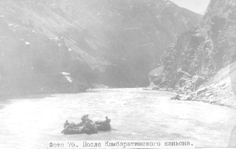 Далее – Торуз-Тороусская котловина. Слева – Казарман. Удобно сделать ночёвку на левом берегу сразу за устьем р.Кекерим (в ней значительно более чистая, чем в Нарыне, вода). Отсюда до устья р.Кекемерен около 35 км при среднем уклоне реки 5,8 м/км. Чистое ходовое время 4 часа. Пороги, каньоны, водовороты. Труднодоступное глухое ущелье. Троп вдоль ущелья нет. Это как раз тот участок, описание которого в “Водных маршрутах СССР. Азиатская часть” ещё с 1975г. манило нас: “Ниже Казармана Нарын уходит в труднодоступное, никем не пройденное и не разведанное ущелье. Вдоль ущелья нет троп, разведка его с берега, видимо, невозможна. Длина каньона около 30 км”. До нас это ущелье было пройдено лишь одной группой – Кузнецова Г.В. в 1981г. В этом ущелье (фото 62-66) быстроток, валы, средние шиверы. Пороги в основном на входе или выходе из каньонов. Три каньонных участка. Нужно опасаться камнепадов.