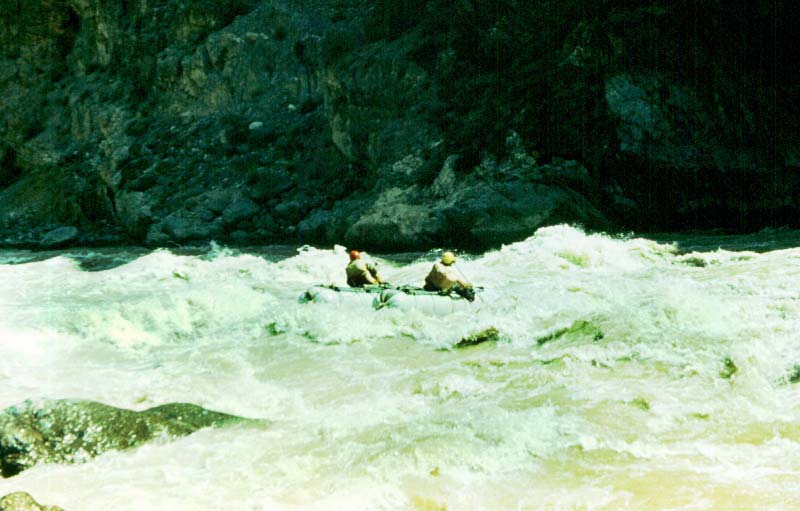Очень сложной оказалась и разведка всего каньона, на которую потребовалось 1,5 дня. Дорога идёт примерно в двух километрах от реки (по левому берегу), но между рекой и дорогой крайне сильно пересечённая местность, так же, как и по берегам вдоль реки в каньоне. Базовый лагерь поставили в конце каньона (там же оставался и один страховщик), а к началу каньона заходили через совхоз им.Калинина., т.к. горы на левом берегу Большого Нарына выполаживаются только возле этого совхоза. И хотя до начала каньона от совхоза идет дорога, пригодная для движения автотранспорта, попутных машин не было, и нам пришлось идти пешком сначала 10 км до устья р.Караташ, а затем ещё 3 км до начала сплава – мы спустились к воде за резким левым поворотом реки в полукилометре ниже начала каньона. Но для этого нам сначала пришлось преодолеть тяжелейший крутой “тягун” (с перепадом высот не менее 0,5 км), а затем такой же тяжелый спуск через осыпи, скалы и густые заросли деревьев и кустарников. Правда, вокруг было много шиповника, жимолости, встречались чёрная смородина и другие ягоды, что поднимало настроение.