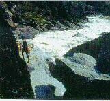 N 43 (ТТТ-). Порогу дали название "Длинный". В малую воду он, наверное, распадется на три отдельных порога. Начинается маневром между камней и сливом через всю реку. Ниже слива река представляет собой лестницу с бочками. Первое ключевое место - это вдающаяся в поток глыба справа, на которую сильный навал и от уровня которой косой слив и бочка. Дальше еще пара сливов, навал на глыбу от левого берега, бочка с пульсаром и ниже, посередине реки, полуобливное ребро скалы. Справа от этого ребра слив и котел, почти без выноса поверху, а слева пологий слив с валом. Ниже череда бочек и валов, уходящих в плавный поворот направо, на котором надводные глыбы в русле. После глыб опять валы и второе ключевое место - сужение русла со сливом и огромной ямой, ниже которой опять валы и бочки до больших глыб. Между глыбами проходы со сливами. Дальше еще метров 150 участок валов, сливов и бочек. Оба ключевых участка хорошо засняты на видеокассету. Потратили массу времени на изучение порога и организацию хоть какой-то страховки.